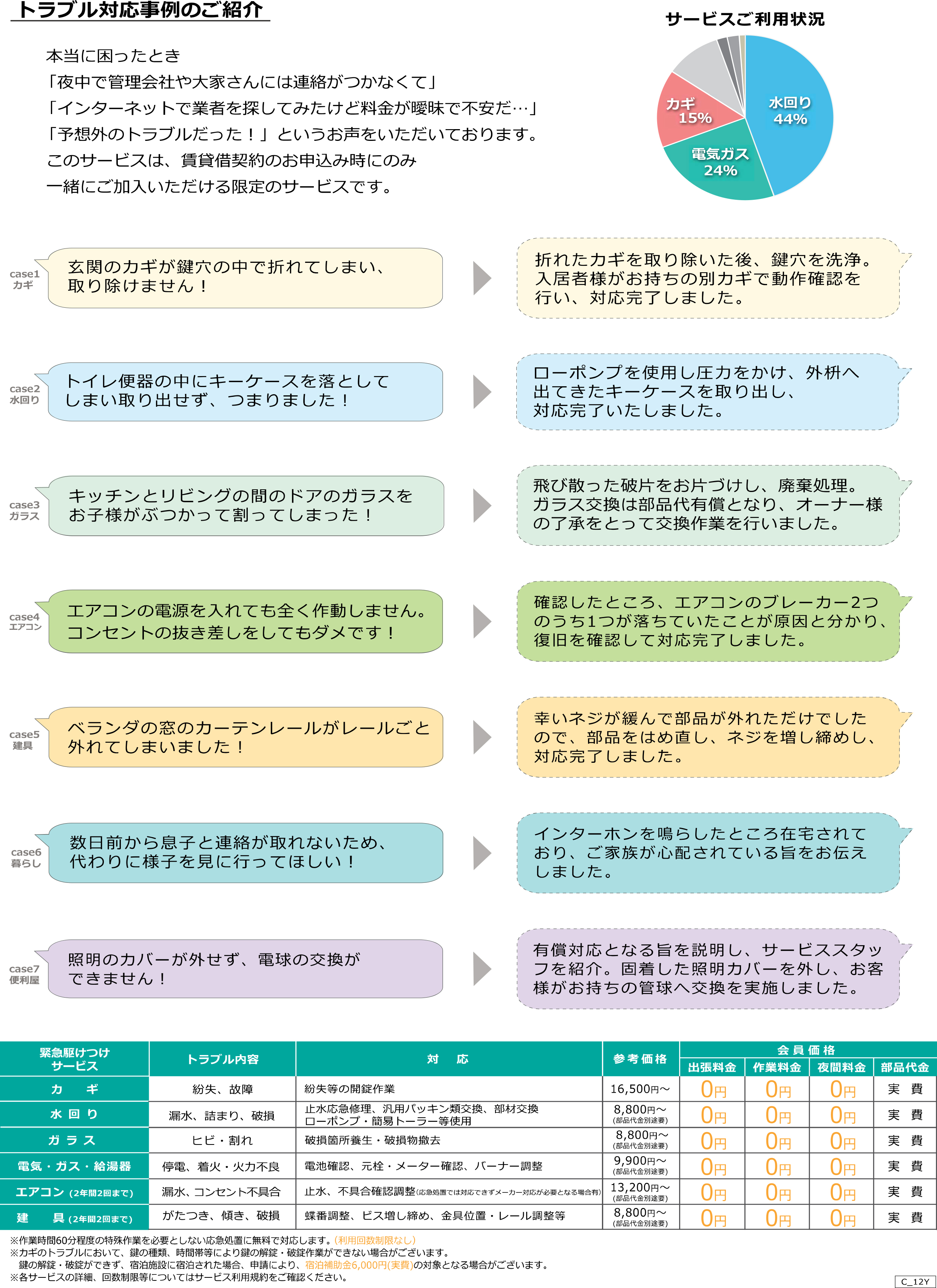 弊社、管理物件にお住まいの方で、「コンシェルジュ24」にご加入頂いているお客様は、暮らしのお困りごとを幅広くサポートして頂ける24時間サポートサービスをご利用になれます。定額で24時間365日トラブルでお困りの時に駆けつけ応急処置をいたします。